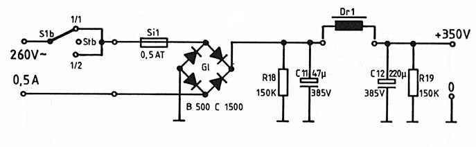 liegen, die Anodenspannung liegt im Leerlauf zwischen 350 V und 380 V, und die Heizspannung muß auf 12,6 V eingestellt