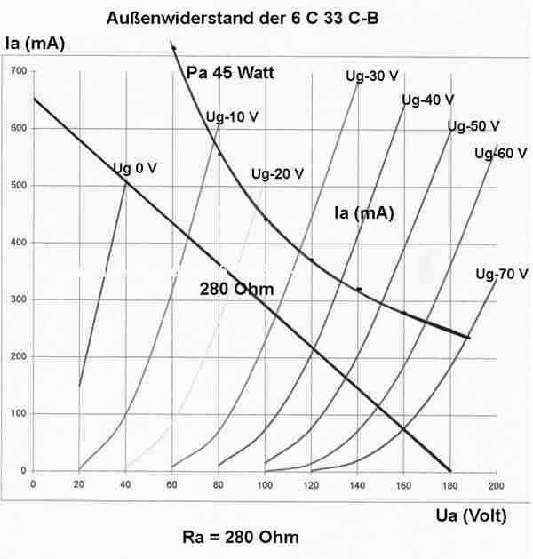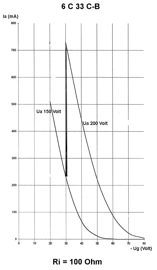 Für die 6C33C gilt als Höchstbelastung der Anode ein Strom von 550mA, die zugelassene Anodenverlustleistung