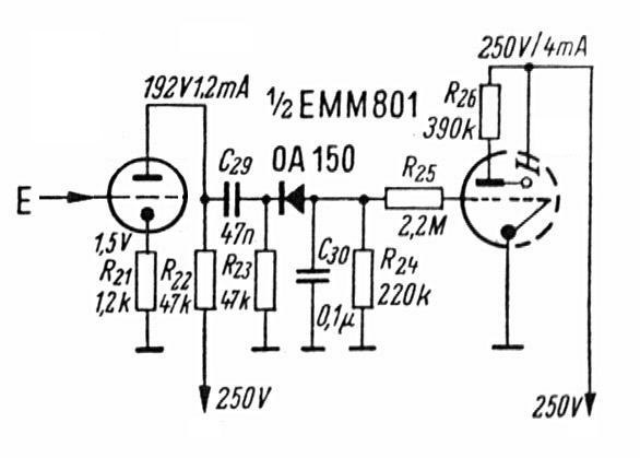 Angesteuert wird das System der EMM 801 mit einem Triodensystem - hier die eine Hälfte einer ECC 82. Diese Triode