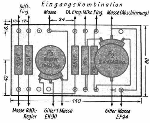 Auf der zweiten Lötösenplatte mit den Abmessungen 140 x 80 x 1 mm sind die Eingangsregler untergebracht. Um die