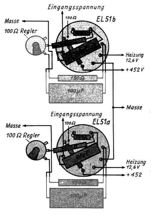 Die Endstufe ist mit den Röhren 2x EL 51 bestückt, die in AB-Schaltung arbeiten. Daraus ergibt sich der Vorteil