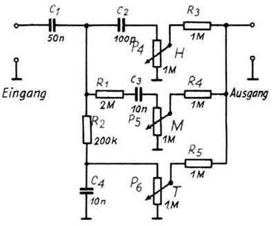 Mit Hilfe des Entzerrungsfilters, das aus RC-Gliedern besteht, können die Höhen, Mitten und Tiefen getrennt