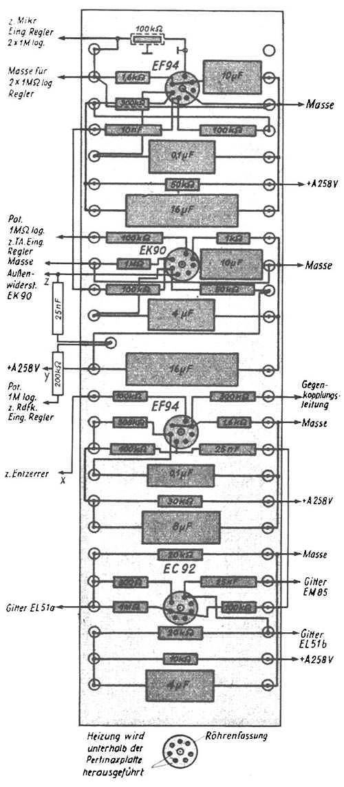 Siebwiderstand (30 kOhm). Die zur Hauptverdrahtungsplatte führenden Leitungen wurden mit x', y' und z' gekennzeichnet.