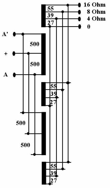 komplette Sekundärwicklung - komplett mit allen Anzapfungen für 4, 8 und 16 W