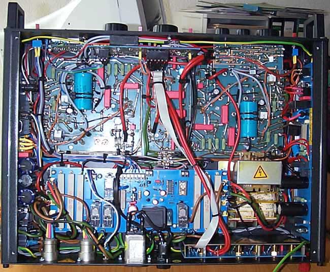 Im folgenden Bild zu erkennen : die sehr gut abgeschirmte Eingangsstufenplatine mit vergoldeten Chinchbuchsen, Kern aus