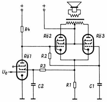 Gitter der ersten Gegentaktröhre (Rö 2) galvanisch mit der Anode der Röhre Rö 1 verbunden, die ihre