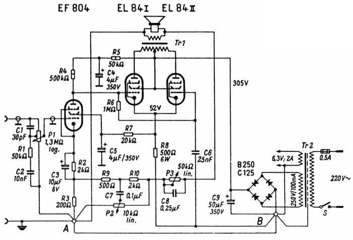 Die endgültige Schaltung - siehe das folgende Bild - wurde daher mit 2 x EL 84 in der Endstufe und der EF 804 als