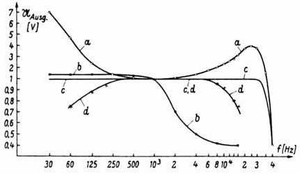 sowie auch mit abgeschalteter Gegenkopplung. Die Spannung des Tongenerators wurde jeweils bei 1000 Hz so eingestellt,