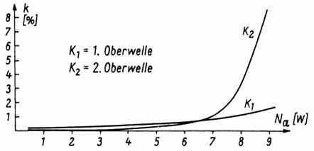 die zweite Oberwelle. Wie die Kurven zeigen, besitzt der Verstärker auch vom Klirrfaktor her (wenn man eine maximale