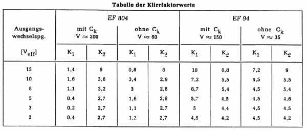 Aus der Tabelle geht zunächst hervor, daß die Klirrfaktoren bei der Röhre EF 804 bis zu einer