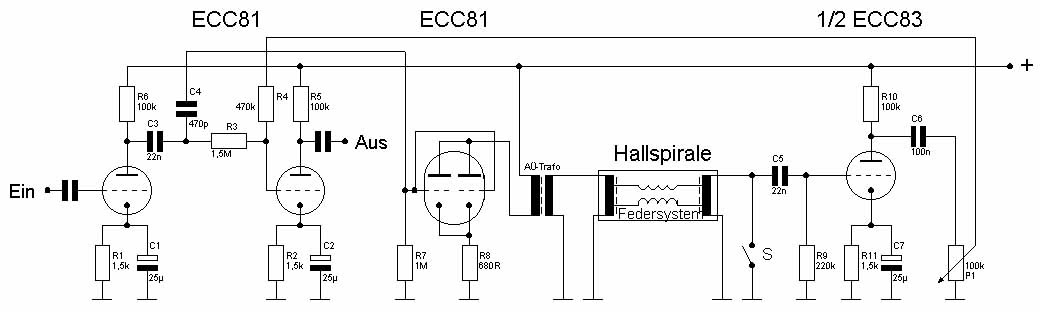 Das folgende Bild zeigt einen handelsübliches Nachhallgerät, hier erkennt man den im obigen Schaltbild dargestellten