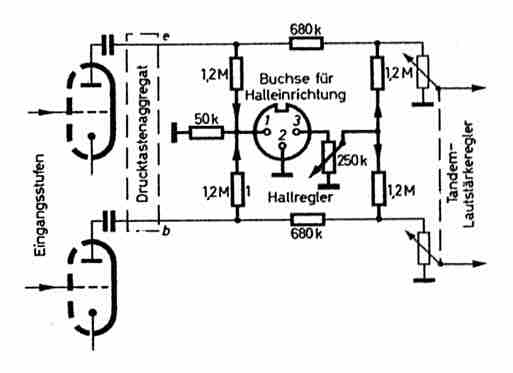 Die Anschaltung der Raumhalleinrichtung erfolgt vor dem Tandem-Lautstärkeregler. Zu diesem Zweck brauchen nur die