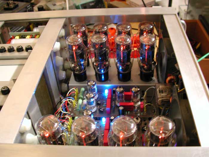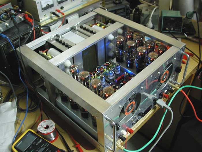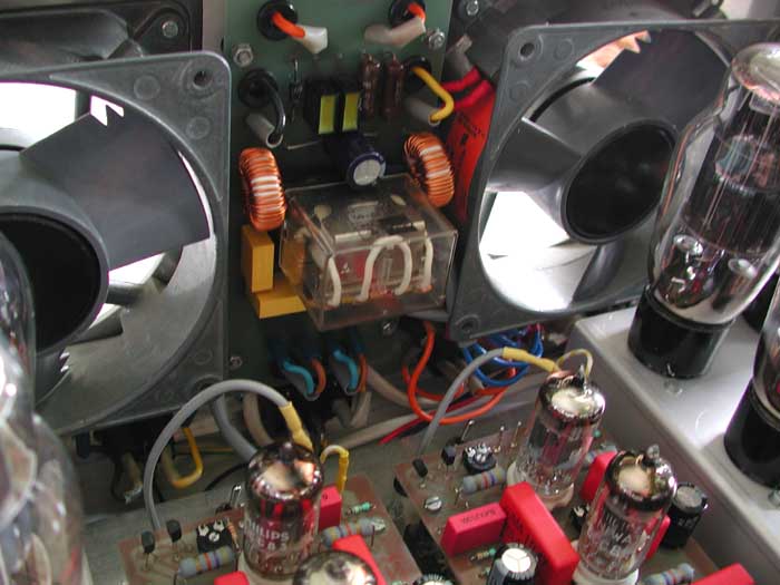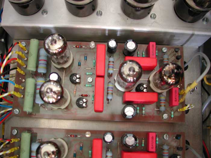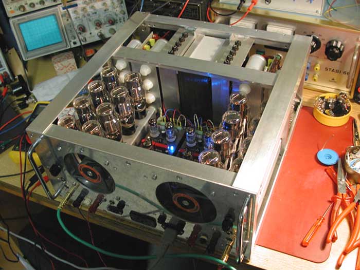 Wichtig! Vor der ersten Inbetriebnahme Gittervorspannung der Endröhren auf min. ca. -75 Volt einstellen (P4 an linken