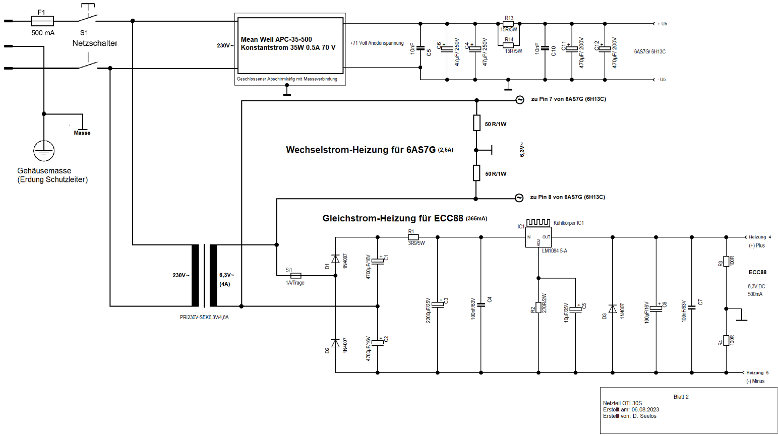 Da ich, aus optischen Gründen, keine große Drossel für die Anodenspannungs-Siebung auf das Gerätgehäuse platzieren wollte, habe ich zwei große 470μF Kondensatoren verwendet.
