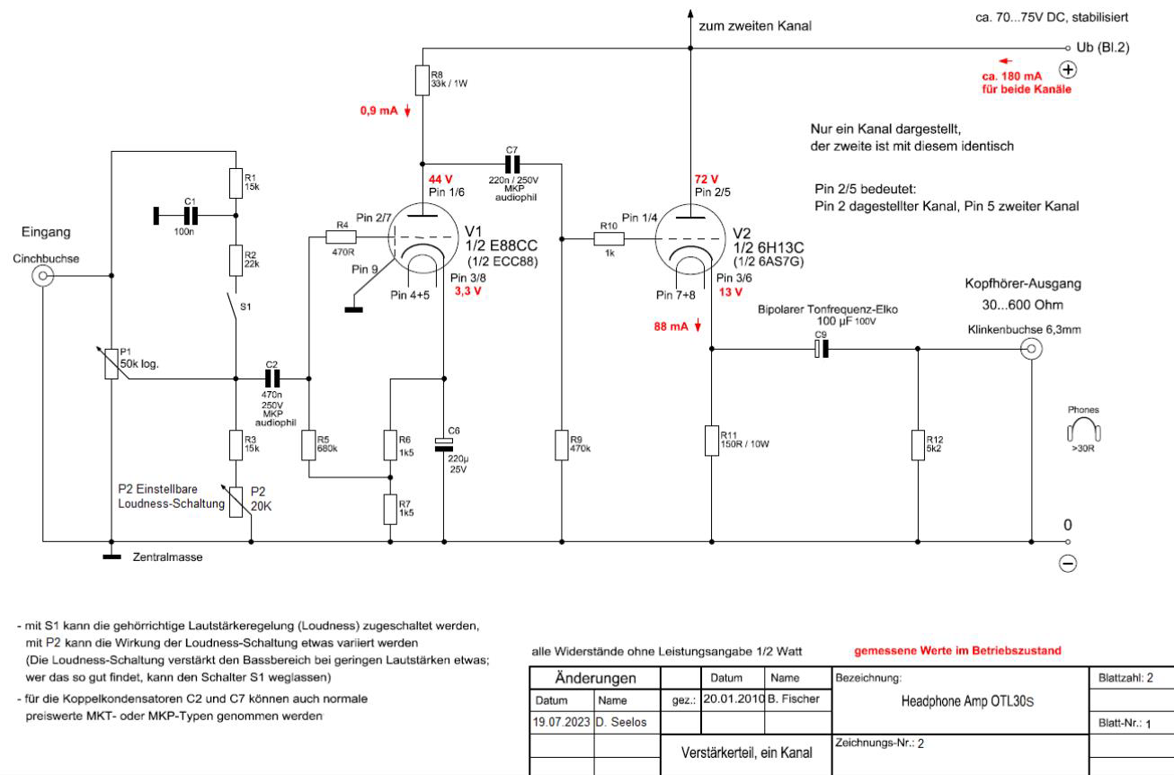 Einen Röhrenverstärker ohne Ausgangsübertrager zu bauen, wollte ich schon immer mal machen. Im Netz fand ich eine Schaltung, welche Bernd Fischer (www.röhrenkiste.de) im Jahre 2010 veröffentlicht hatte. Mir gefiel die Einfachheit der Verstärker-Schaltung und dass dieser Verstärker mit Kopfhörern von 30 bis 600 Ohm funktioniert.