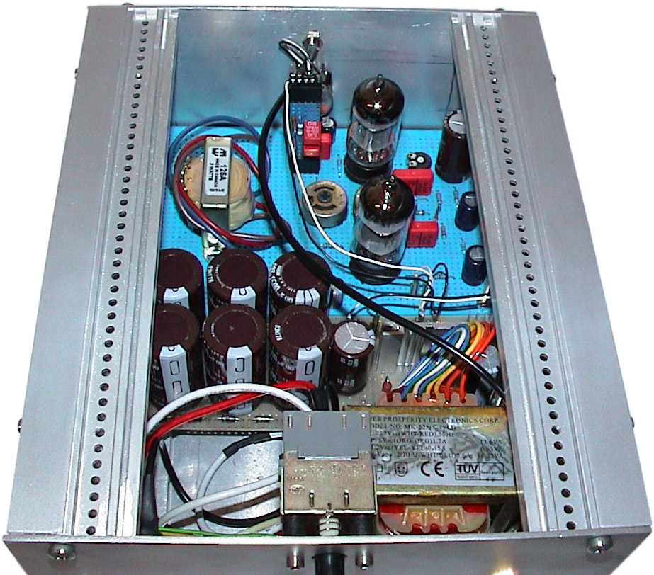 Der Blick auf die Schaltung offenbart keine besonderen Geheimnisse. Oder doch? Auf den ersten Blick wird man feststellen, dass es keinen Rückkopplungszweig gibt. Auf den zweiten Blick wird man dann das Frequenzgangkorrekturglied finden. Dieses sitzt hinter der ersten Triode, die als normale verstärkende Stufe beschaltet ist. Das Korrekturglied schwächt mittlere und hohe Töne um ca. 8dB ab und hebt auf diese Art und Weise die Bässe an. Das Maß lässt sich durch das Widerstandverhältnis (39k zu 56k) einstellen, der Einsatzpunkt mittels des Kondensators (680n). Bei tiefen Frequenzen ist der Kondensator hochohmig, so dass hier keine nennenswerte Abschwächung erfolgt. Fehlende Höhen könnten durch Überbrücken des gesamten T-Gliedes mittels eines kleinen Kondensators angehoben werden, das ist hier aber nicht nötig.