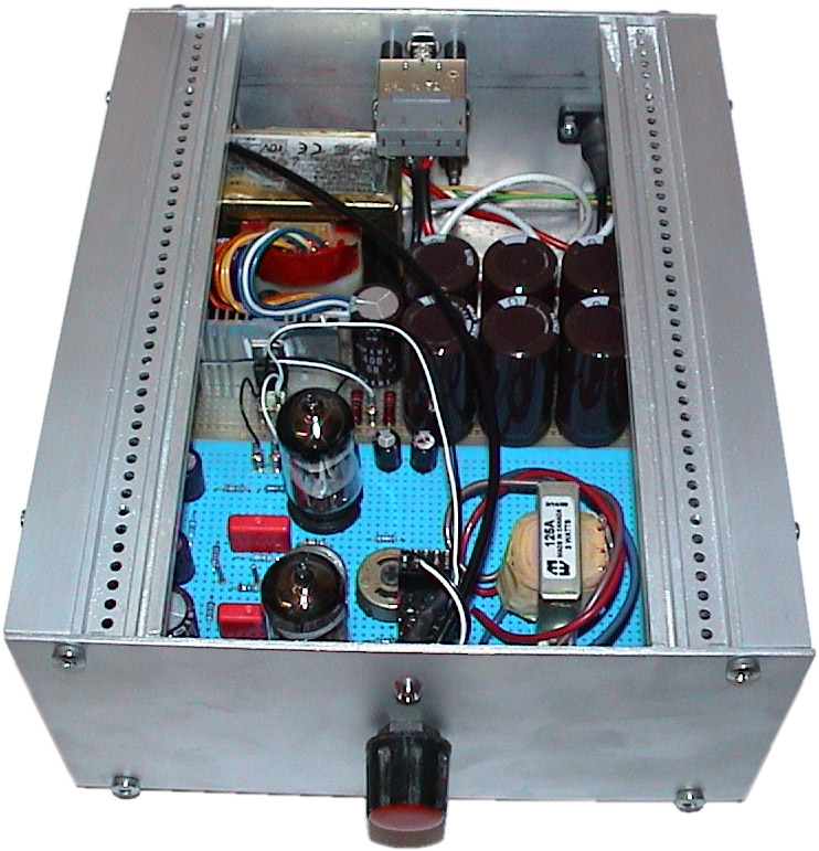 Die beiden Trimmer dienen zur Ruhestrom- und Symmetrieeinstellung des Ausgangssignals. Die Röhren werden hier ziemlich heiß gefahren, bei ca. 190V Anodenspannung fließen 13mA Anoden- und 2mA Schirmgitterstrom. Angegeben wird die Röhre mit max. 14mA bis 140V oder 10mA bis 170V, insgesamt aber nicht mehr als 1,7W Anodenverlustleistung. Der Ruhestrom lässt sich über den 1 Ohm Widerstand messen, es fallen hier 30mV für beide Röhren ab. Ob dieser Arbeitspunkt zu hoch gewählt wurde, wird der Betrieb zeigen. Ansonsten einfach den 100 Ohm Trimmer auf einen größeren Wert stellen.